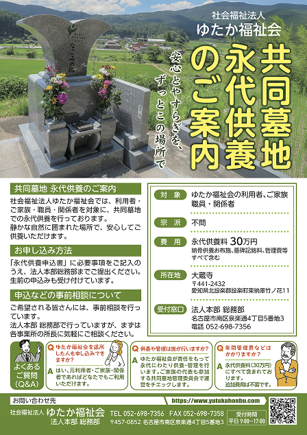 身寄りのない方やご家族の負担を減らしたい方のために、安心して利用できる共同墓地を整備しています。生涯を通じた支援の一環として、ご希望に沿った形で対応しています。