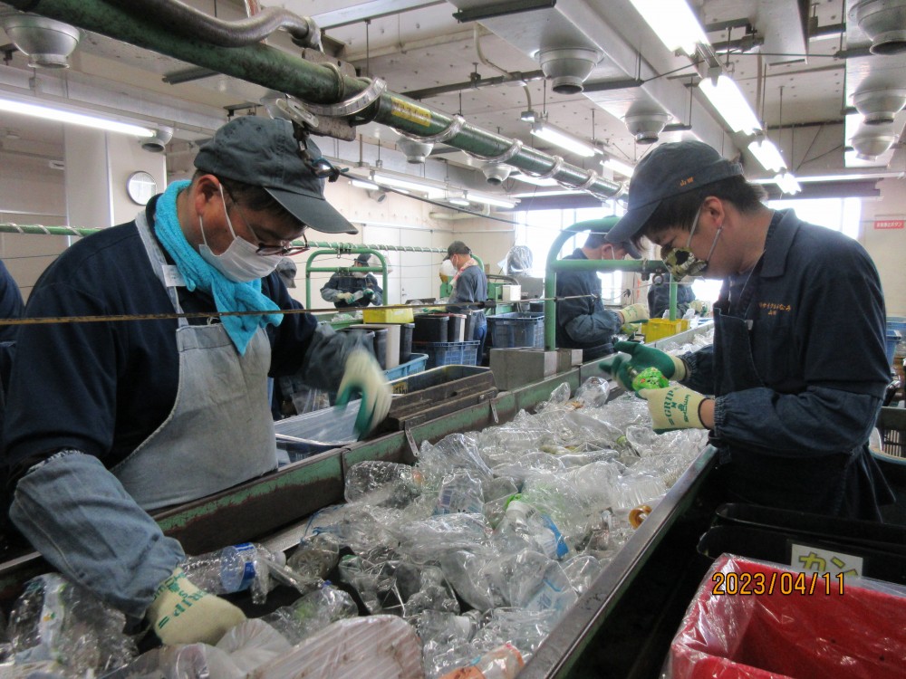 名古屋市の委託を受け、ペットボトルと紙パックを資源化する仕事を担っています。市内から運ばれた使用済みペットボトルには、ビンや缶、プラスチック製や紙製の容器包装等が混入しています。それをベルトコンベヤ上で取り出し、再度分別しなおします。ペットボトルはキャップを外し、混入物を取り除いてより再商品化しやすい資源にしています。環境を守りSDGsに貢献するやりがいのある仕事で、高工賃を目指しています。